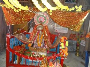 समुद्र तल से लगभग 1829 मीटर की ऊंचाई पर स्थित यह मंदिर रानीखेत से लगभग सात किलोमीटर दूर है और पूरे क्षेत्र के लिए यह एक आध्यात्मिक आशीर्वाद के समान है। मंदिर देवी दुर्गा को समर्पित है और इसे ‘झूला देवी’ कहा जाता है क्योंकि यहां देवी की प्रतिमा एक झूले (पालने) पर विराजमान है। स्थानीय लोक-कथाओं के अनुसार यह मंदिर लगभग 700 वर्ष पुराना है। कभी यह पूरा क्षेत्र तेंदुए और बाघों के आतंक से त्रस्त था। ग्रामवासियों ने रक्षा की कामना से मां दुर्गा की तपस्या की। एक दिन एक चरवाहे को स्वप्न में मां ने दर्शन दिए और एक निश्चित स्थान पर खुदाई करने को कहा। अगली सुबह जब उस स्थान की खुदाई की गई, तो वहां मां की प्रतिमा प्राप्त हुई। उसी स्थान पर मंदिर का निर्माण हुआ और मां की मूर्ति को स्थापित किया गया। कहा जाता है कि प्रतिमा स्थापना के बाद जंगली जानवरों का आतंक धीरे-धीरे समाप्त हो गया। कुछ समय बाद सावन के महीने में छोटे बच्चों को झूला झूलते देखकर माता ने उसी चरवाहे को स्वप्न में फिर से दर्शन दिए और इच्छा जताई कि उन्हें भी झूले पर बैठाया जाए। अगले ही दिन मां को मंदिर में झूले पर स्थापित कर दिया गया और तभी से यह मंदिर ‘झूला देवी मंदिर’ कहलाया।