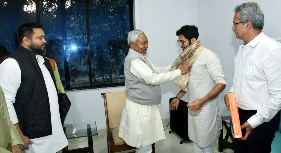 महाराष्ट्र की सत्ता गंवाने और शिवसेना में विभाजन के बाद आदित्य ठाकरे फिर से अपना राजनीतिक आधार मजबूत करने में जुटे हैं। बिहार के दौरे पर पहली बार पहुंचे उद्धव ठाकरे के बेटे आदित्य ठाकरे ने 23 नवंबर को अपने प्रतिनिधि मंडल के साथ मुख्यमंत्री नीतीश कुमार और उपमुख्यमंत्री तेजस्वी यादव से मुलाकात की है। यह मुलाकात ऐसे समय पर हुई है,जब शिवसेना दो गुटों में बंट चुकी है और महानगरपालिका बीएमसी चुनाव सिर पर है।