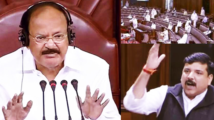 किसानों के मुद्दे को लेकर राज्यसभा में भारी हंगामा कर रहे आम आदमी पार्टी के तीनों सांसद संजय सिंह, सुशील कुमार गुप्ता और एन.डी. गुप्ता को आज दिन भर के लिए निष्कासित कर दिया गया। सभापति एम. वेंकैया नायडू ने शून्यकाल काल के बाद राष्ट्रपति के अभिभाषण पर चर्चा कराने का प्रयास किया तो आप के तीनों सांसद अपनी सीटों पर खड़े होकर नारे लगाने लगे। उन्होंने ‘कृषि कानूनों को रद्द करो’ के नारे लगाए।