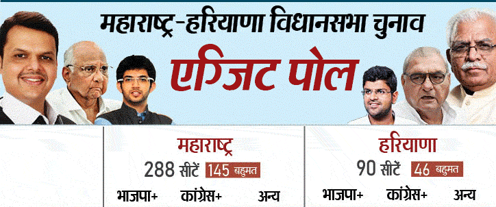 महाराष्ट्र में 288 विधानसभा सीटों और हरियाणा में 90 विधानसभा सीटों पर मतदान पूरा हो चुका है। शाम छह बजे तक महाराष्ट्र में 55 फीसदी और हरियाणा में 62 फीसदी मतदान हुआ। चुनाव नतीजे 24 अक्तूबर को सामने आएंगे।लेकिन नतीजे से पहले एग्जिट पोल नतीजों का दौर शुरू हो गया है। तमाम न्यूज चैनल और एजेंसियों एग्जिट पोल नतीजे बता रही हैं। किस एजेंसी के एग्जिट पोल में क्या अऩुमान जताया गया है हम आपको बता रहे हैं।