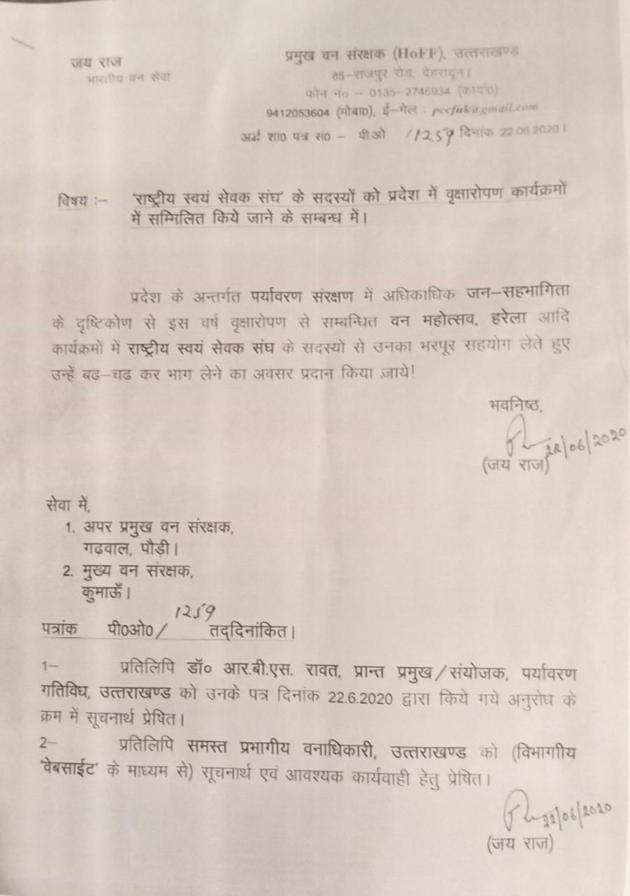 वन विभाग के प्रमुख वन संरक्षक जयराज द्वारा प्रदेश में मनाए जाने वाले वन महोत्सव हरेला पर्व पर राज्य में राष्ट्रीय स्वयंसेवक संघ आरएसएस का सहयोग लिए जाने का शासनादेश जारी होने के बाद विपक्ष ने जमकर सरकार पर निशाना साधा है। नेता प्रतिपक्ष इंदिरा ह्रदयेश का कहना है कि यह हरेला पर्व पूरे प्रदेश का है और कांग्रेस की हरीश रावत सरकार ने इसे ग्राम पंचायतों और ग्रामीणों को समर्पित किया था लेकिन आजादी के बाद पहली बार इस सरकार ने और वन विभाग के चीफ ने शासनादेश निकालकर जो आरएसएस को सहयोग लेने की बात कही है वह बेहद निंदनीय है। वृक्षारोपण हर कोई करने को स्वतंत्र है स्वयं विपक्ष भी आरएसएस का विरोध नहीं करता लेकिन इस मानसिकता का विरोध करता है, जो इस पत्र के माध्यम से दर्शाई गई है। यही नहीं नेता प्रतिपक्ष इंदिरा हृदयेश ने कहा कि आरएसएस से वन विभाग के चीफ को इतना ही लगाव है तो वह सरकारी नौकरी छोड़कर आरएसएस और भाजपा ज्वाइन कर लें। बेलगाम नौकरशाही को लेकर नेता प्रतिपक्ष ने निशान साधते हुए कहा कि कांग्रेस की सरकार आने पर बेलगाम नौकरशाहों पर शिकंजा कसते हुए विकास कार्यो और प्रदेश में जनहित के कार्यो को धरातल पर लाने का काम किया जाएगा।
