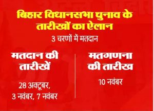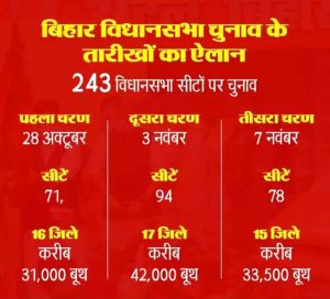 इस बार तीन चरणों में विधानसभा चुनाव होंगे। 28 अक्टूबर को पहले चरण की वोटिंग होगी, 10 नवंबर को वोटों की गिनती होगी। आज 25 सितंबर को चुनाव आयोग ने प्रेस कॉन्फ्रेंस कर पूरा चुनावी कार्यक्रम जारी कर दिया। इसी के साथ सूबे की 243 विधानसभा सीटों पर कब-कब वोटिंग होगी ये साफ हो गया है। चुनावी कार्यक्रम जारी होने के बाद सभी सियासी दलों ने अपनी रणनीतिक तैयारी तेज कर दी है।