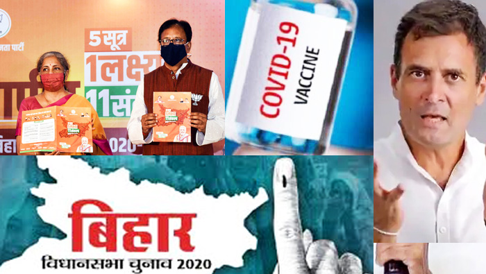 बिहार विधानसभा चुनाव होने में अब कुछ ही दिन बाकी हैं। राज्य में सभी राजनीतिक पार्टियां जोर – शोर से चुनाव प्रचार में जुटी हैं और एक दूसरे पर आरोप -प्रत्यरोप की राजनीति भी जोरों पर है। इस बीच सभी पार्टियों ने अपने -अपने घोषणा पत्र भी जारी किए। लेकिन भारतीय जनता पार्टी ने अपने घोषणा पत्र में बिहार के लोगों के लिए 19 लाख नौकरियां और मुफ्त में कोरोना वैक्सीन का जो वादा किया उससे भाजपा चौतरफा घिरती नजर आ रही है।