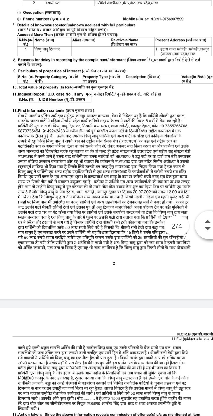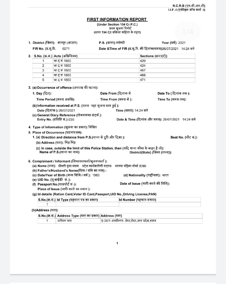 पूजा बंसल ने रविवार को इस बाबत कानपुर में शिकायत दर्ज की है। पूजा ने एक सांसद से इस मामले की बाबत रिपोर्ट दर्ज कराने की बात कही। जिसमें सांसद ने कानपुर के एसपी और सीओ से बात की है । बताया जा रहा है कि पुलिस ने रिपोर्ट दर्ज करने के लिए 24 घंटे का समय मांगा है। फिलहाल 24 घंटे का समय पूरा होते ही कानपुर पुलिस ने विष्णु बाबू दिवाकर के खिलाफ रिपोर्ट दर्ज कर ली है।