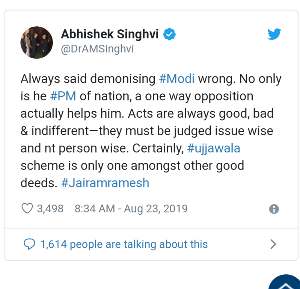 सिंघवी और शशि थरूर जयराम रमेश के पक्ष में मैदान में उतर आए lआज शुक्रवार के दिन सिंघवी ने जयराम रमेश का पक्ष लेते हुए कहा ” व्यक्ति का विरोध करना उचित नहीं हमें ईशु वाइज प्रधानमंत्री को सही या गलत ठहराना चाहिए ” सिंघवी ने आगे कहा कि प्र”धान मंत्री भारत के प्रधानमंत्री हैं और विपक्ष का काम उन की मदद करना है l किसी के भी निर्णय गलत या सही हो सकते हैं इसलिए उनको उनके निर्णय के आधार पर तोला जाना चाहिए ना कि उनके व्यक्तित्व के आधार पर ” l सिंघवी ने प्रधानमंत्री की “उज्जवला योजना ” को बहुत महत्वपूर्ण योजना बताते हुए उनकी सराहना भी की l
