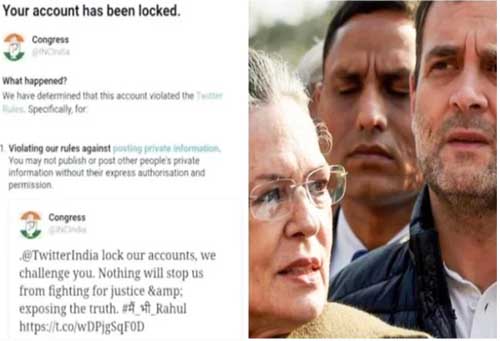 कांग्रेस के सोशल मीडिया हेड रोहन गुप्ता ने कहा कि ट्विटर के अनुसार नियमों के उल्लंघन के लिए पार्टी का अकाउंट ब्लॉक कर दिया गया है। लेकिन मैं कहना चाहता हूं कि ट्विटर सरकार के दबाव में काम कर रहा है। इसने पूरे भारत में हमारे नेताओं और कार्यकर्ताओं के 5 हजार खातों को पहले ही ब्लॉक कर दिया है। उन्हें यह समझने की जरूरत है कि ट्विटर या सरकार द्वारा हम पर दबाव नहीं डाला जा सकता।