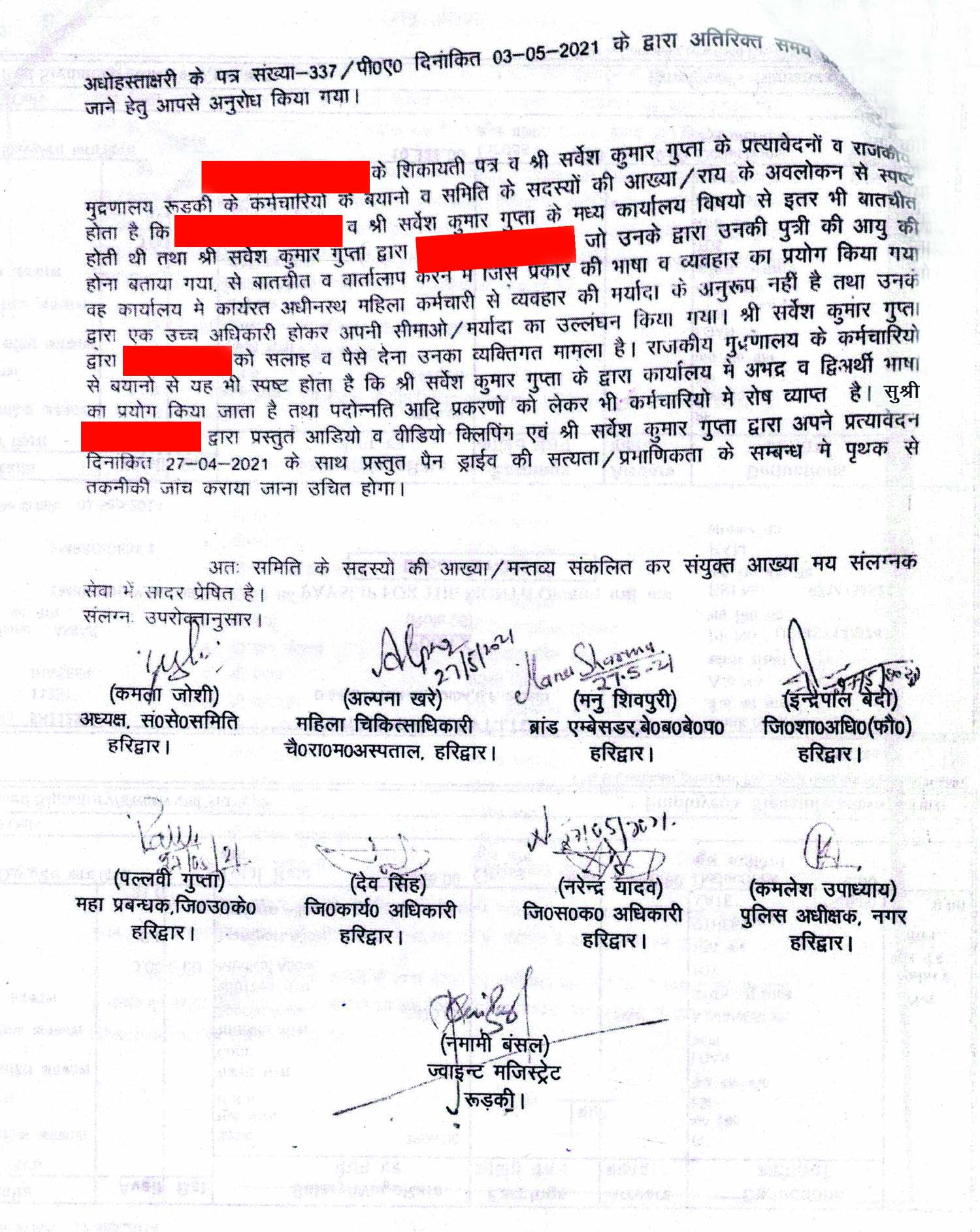 हरिद्वार की जिला उद्योग केंद्र की महाप्रबंधक पल्लवी गुप्ता ने अपनी जांच रिपोर्ट में आरोपी अधिकारी को दोषी माना है। उन्होंने कहा है कि ‘अधिकांश कर्मचारियों जिनमें महिला कर्मचारी भी शामिल हैं, द्वारा सर्वेश कुमार गुप्ता के अभद्र व्यवहार एवं द्विअर्थी भाषा का प्रयोग करना स्वीकार किया गया है तथा यह भी महसूस किया गया है कि उनके विभागाध्यक्ष रहने से