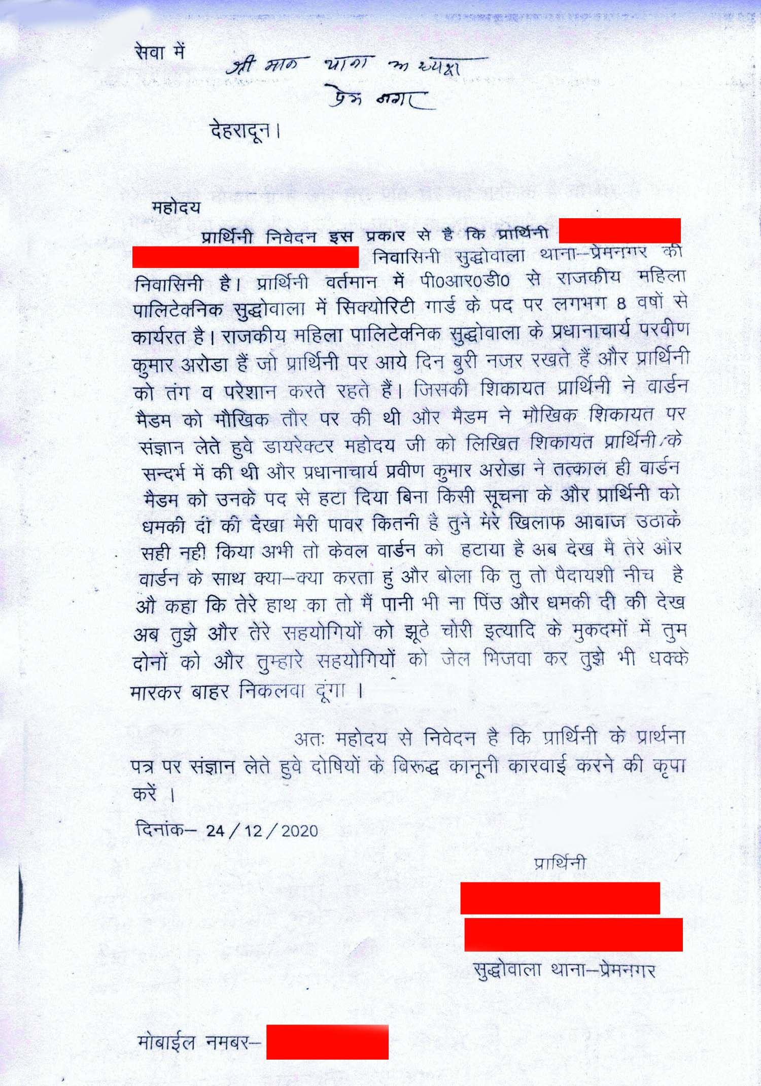 देहरादून में ही एक अन्य यौन शोषण का मामला प्रकाश में आया है। राजकीय महिला पॉलिटेक्निक, सुद्धोवाला में एक सुरक्षाकर्मी पिछले 8 वर्षों से कार्यरत थी। दिसंबर 2020 में इस महिला सुरक्षाकर्मी ने थाना प्रेमनगर देहरादून में पॉलिटेक्निक कॉलेज के प्रधानाचार्य प्रवीण कुमार अरोड़ा पर यौन शोषण के आरोप लगाए। इस पत्र की प्राप्ति के बाद भी थाना प्रेमनगर ने कोई कार्यवाही नहीं की, उल्टे अप्रैल 2021 में प्राचार्य द्वारा इस महिला को ही नौकरी से बाहर कर दिया गया। महिला का आरोप है कि प्राचार्य प्रवीण कुमार अरोड़ा के दुराचरण की शिकायत जब संस्थान के वार्डन से की गई तो प्राचार्य ने वार्डन को ही उनके पद से हटा डाला। इतना ही नहीं अरोड़ा ने पीड़िता को धमकाया भी कि वह अब उसके खिलाफ भी कड़ा कदम उठाएगा।