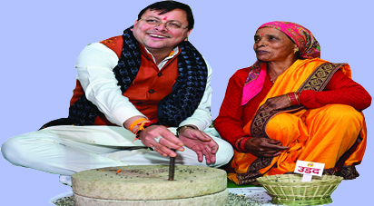 413 करोड़ की विकास योजनाओं का लोकापर्ण एवं शिलान्यास। हस्तशिल्प कला प्रदर्शनी का अवलोकन करते समय सीएम धामी महिला उद्यमी के साथ जमीन पर ही बैठ गए और अपने हाथों से चक्की चलाने लगे। महिलाओं का उत्साहवर्धन करने के लिए उनकी मदद की और अपने हाथों से टोकरी भी बनाई।