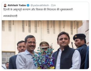 इसके साथ ही सपा ने अपने आधिकारिक ट्वीट में कहा कि दिल्ली विधानसभा चुनाव में शानदार जीत हासिल करने पर आम आदमी पार्टी और उनके नेता अरविंद केजरीवाल जी को हार्दिक बधाई एवं शुभकामनाएं। विषम परिस्थितियों में भी आप कार्यकर्ताओं की कड़ी मेनहत का यह परिणाम है। दिल्ली के समस्त मतदाताओं को नई सरकार की बधाई ”