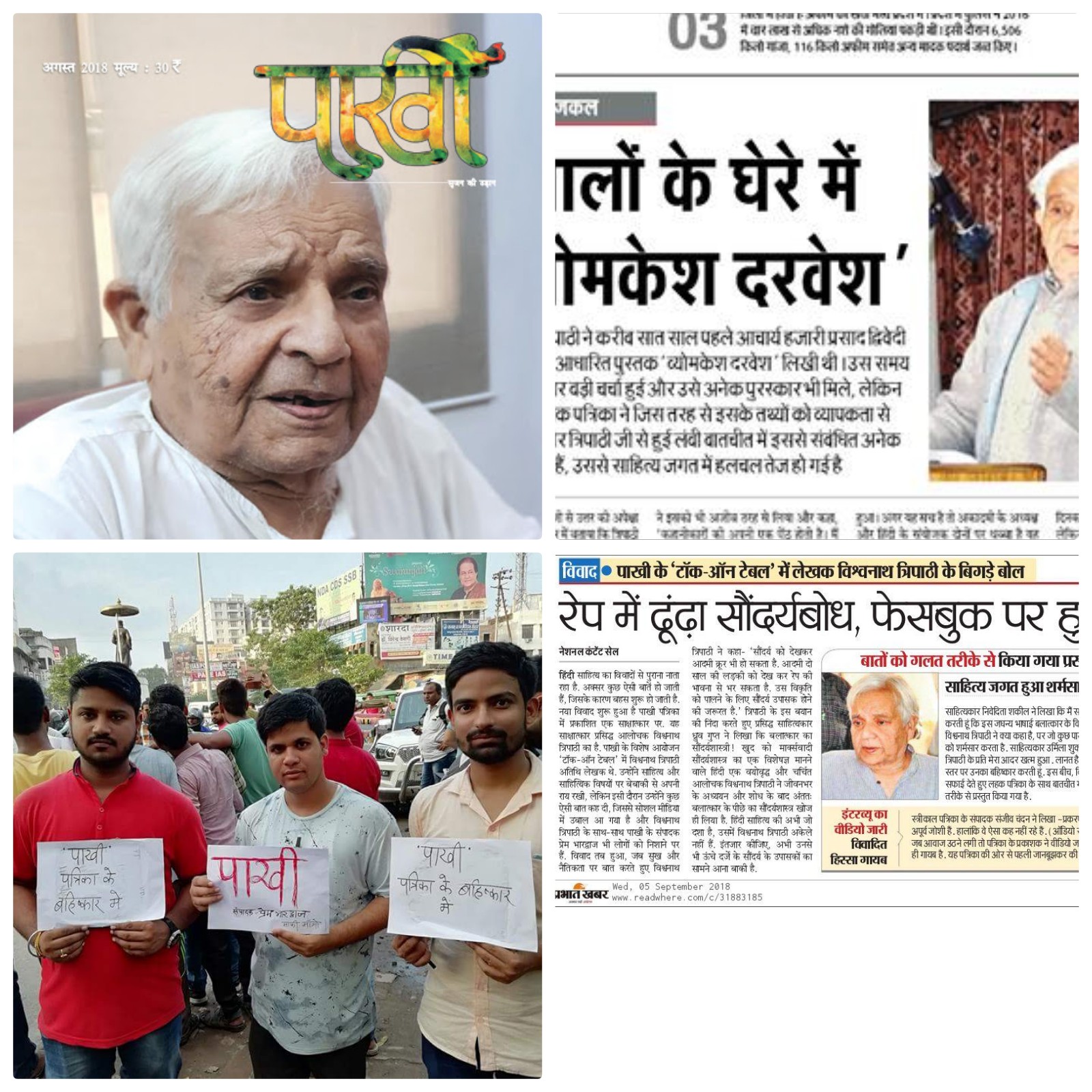 साहित्यक पत्रिका ‘पाखी’ के नवीनतम अंक में वरिष्ठ आलोचक श्री विश्वनाथ त्रिपाठी संग हुई लंबी बातचीत इन दिनों विवादों के घेरे में है। एक विचारधारा विशेष से जुड़े पाठक वर्ग और संगठनों का मानना है कि इस साक्षात्कार के चलते श्री त्रिपाठीजी की छवि प्रभावित हुई है। इसी क्रम में बनारस हिन्दू विश्वविद्यालय में ‘पाखी’ के खिलाफ विरोध प्रदर्शन किया गया। दूसरी तरफ दैनिक ‘प्रभात खबर’ और दैनिक ‘दैनिक जागरण’ ने इसे अपनी तरफ से देखा और इस पर समाचार प्रकाशित किया है।