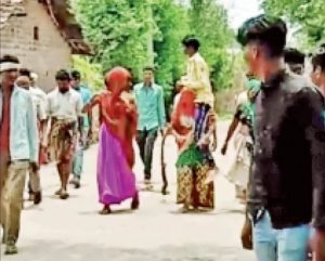 अब जब वह महिला कुछ समय बाद वापस अपने गांव लौटी तो सज़ा के तौर पर ससुराल वालों ने और गांव के लोगों ने विवाहिता को मजबूर किया कि वह अपने पति को कंधे पर 7 किलोमीटर बैठाकर घुमाए। महिला पति को कंधों पर बिठाकर चलने लगी तो जनता उसे जूते चप्पल मारने लगी। पिटाई से बचने के लिए महिला भागती रही तो गांव के लोग विडियों बनाते रहे।