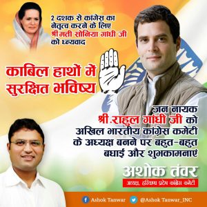 हरियाणा कांग्रेस के पूर्व अध्यक्ष अशोक तंवर का ‘हुडडा कांग्रेस’ से इस्तीफा