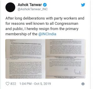 इस तरह दो दिन के घटनाक्रम के बाद आज हरियाणा के पूर्व कांग्रेस अध्यक्ष अशोक तंवर ने पार्टी की प्राथमिक सदस्यता से इस्तीफा दे दिया है। उन्होंने अपने ट्विटर हैंडल पर इस्तीफा पोस्ट किया है। दो दिन पहले तंवर ने हरियाणा कांग्रेस की सभी चुनाव समितियों से इस्तीफा दे दिया था। वे विधानसभा चुनाव में उम्मीदवारों के चयन को लेकर नाराज हैं और टिकट वितरण में खरीद-फरोख्त का आरोप लगा चुके हैं।