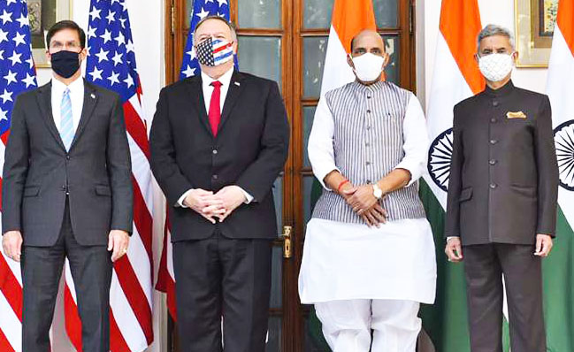 टू प्लस टू बैठक में अमेरिकी विदेश मंत्री माइकल पोंपियो ने कहा कि आज दो महान लोकतंत्रों के और करीब आने का शानदार अवसर है। हमारे पास कोरोना महामारी के बीच सहयोग, हिंद प्रशांत क्षेत्र में चीनी कम्युनिस्ट पार्टी की आक्रामकता  समेत चर्चा के लिए कई अहम मुद्दे हैं।