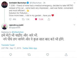 आपको जानकारी के लिए बता दें कि अमिताभ बच्चन द्वारा सोशल मीडिया पर एक ट्वीट करते हुए मुंबई मेट्रो की तारीफ की गई थी और उन्होंने कहा था कि- ये प्रदूषण का समाधान है । मेरे एक दोस्त को मेडिकल इमरजेंसी थी, उसने कार के बदले मेट्रो से जाना चुना । वापस आकर उसने बताया था कि मेट्रो तेज, सुविधाजनक और सबसे सही है । बिग बी ने आगे अपने ट्वीट में लिखा था कि प्रदूषण का समाधान. अधिक पेड़ उगाओ, मैंने अपने बगीचे में लगाए हैं । क्या आपने लगाए हैं ?