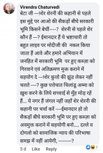 भूमाफिया इसलिए बौखलाई घूम रही है, क्योंकि जानती है अगर इसके खिलाफ शिकायत करने का सिलसिला बंद नहीं किया गया तो बहुत जल्दी यह रोड पर आ जाएगी और उसके गुंडों की टोली इसे छोड़कर भाग खड़ी होगी। एक पोस्ट में वह लिखते हैं कि ज्यादा कहानीकार न बनो लोग तुम्हारी औकात जानते हैं….. शेरनी मामी जी गधों के मुंह ना लगो।फर्जी मुकदमे लिखाओ और सुपारी बांटो ….सोशल मीडिया फेसबुक पर पत्रकार के पक्ष मे भी बहुत से लोग सामने आए हैं।