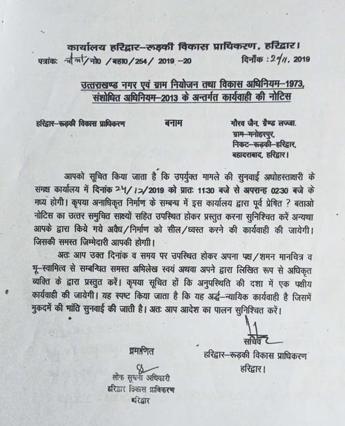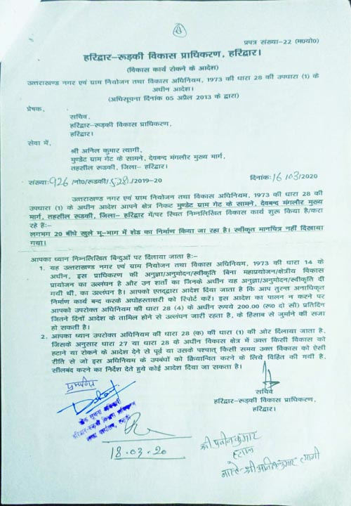 सूत्रों से प्राप्त जानकारी के अनुसार अवैध काॅलोनी काटकर राज्य सरकार को करोड़ों के राजस्व का चूना लगाने वाले काॅलोनाइजरों, भू-माफियाओं को विकास प्राधिकरण में बैठे कुछ अधिकारियों का वरदहस्त प्राप्त है। यही वजह है कि वे बिना किसी भय के सील की गई इमारतों में भी निर्माण कार्य चालू किए हुए हैं, ऐसा नहीं है कि इस प्रकार के कारनामों की भनक प्राधिकरण में बैठे अधिकारियों को न हो, पूरा मामला जानकारी में होने के बावजूद अवैध निर्माण पर कार्रवाई को लेकर अधिकारियों की चुप्पी रहस्यमय नजर आती है। हरिद्वार-रुड़की विकास प्राधिकरण और भू-माफियाओं के बीच चल रहे गठजोड़ का इससे बड़ा प्रमाण भला और क्या हो सकता है कि प्राधिकरण के अधिकारियों को जहां भी अवैध निर्माण या अनधिकøत काॅलोनी काटे जाने की सूचना मिलती है, तो कार्यवाही के नाम पर मात्र एक नोटिस काटकर कर्तव्य की इतिश्री कर ली जाती है। यह गोरखधंधा पिछले कई सालों से लगातार जारी है। कार्यवाही के नाम पर नोटिस का खेल ऐसे खेला जा रहा है कि जिसका शायद ही कोई उदाहरण मिलता हो।