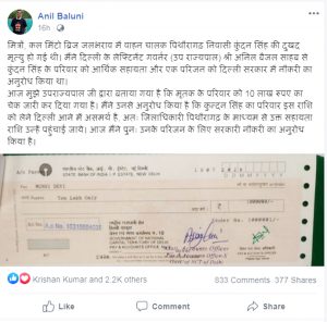 बलूनी हमेशा उत्तराखंड के लिए अच्छा कार्य करने का प्रयास करते रहते हैं l इस बार  उन्होंने वाहन  चालक पिथौरागढ़ निवासी कुंदन सिंह की दुखद मृत्यु के बाद दिल्ली के लेफ्टिनेंट गवर्नर (उप राज्यपाल) श्री अनिल बैजल से कुंदन सिंह के परिवार को आर्थिक सहायता और एक परिजन को दिल्ली सरकार में नौकरी का अनुरोध किया है ।अनिल बलूनी के इस  प्रयास के बाद उपराज्यपाल द्वारा मृतक के परिवार को 10 लाख रुपए का चेक जारी कर दिया गया।कुंदन सिंह का परिवार इस राशि को लेने दिल्ली आने में असमर्थ है, अतः जिलाधिकारी पिथौरागढ़ के माध्यम से उक्त सहायता राशि उन्हें पहुंचाई जाने व उनके परिजन के लिए सरकारी नौकरी के लिए अनिल बलूनी ने राज्यपाल से अनुरोध किया lपीड़ित परिवार के लिए बीजेपी के राज्यसभा सांसद फिर संकट मोचक साबित हुए हैं।