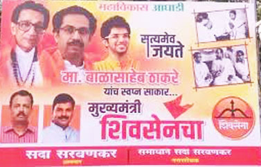 महाराष्ट्र में आज शाम उद्धव ठाकरे के शपथ ग्रहण से पहले शिवसेना भवन के पास इंदिरा गांधी और बाल ठाकरे के पोस्टर लगे हुए हैं। पोस्टर में सत्यमेव जयते लिखते हुए कहा गया है कि बाला साहेब ठाकरे का सपना पूरा होने वाला है। इसके ऊपर इंदिरा और बाला साहेब ठाकरे की एक पुरानी तस्वीर भी नजर आ रही है।