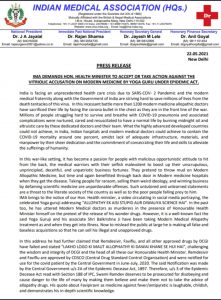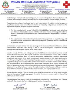 साथ ही आईएमए ने मुखर होकर कहा कि आईएमए मांग करती है और यह संकल्प लेती है कि अगर मंत्री (हर्षवर्धन) स्वत: संज्ञान कार्रवाई नहीं कर रहे हैं तो हमें आम आदमी के समक्ष सच्चाई लाने के संघर्ष के लिए लोकतांत्रिक माध्यमों का सहारा लेना पड़ेगा और न्याय पाने के लिए न्यायपालिका का दरवाजा खटखटाना पड़ेगा।