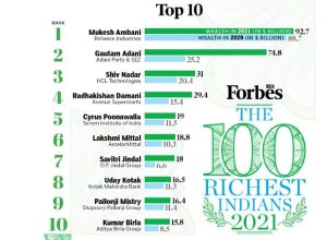 7 अक्टूबर, गुरुवार को जारी फोर्ब्स की सूची के अनुसार, देश के शीर्ष 100 सबसे अमीर भारतीयों की कुल संपत्ति 775 अरब आंकी गई है। चालू वर्ष (2020) में उनकी संपत्ति 50 फीसदी बढ़कर 257 अरब हो गई है। देश में कोरोना के साथ शुरू हुए लॉकडाउन से हजारों लोगों ने नौकरियों को खो दिया। साथ ही बहुसंख्यकों की आय कम हो गई, लेकिन साथ ही साथ देश के अमीर समृद्ध हुए।