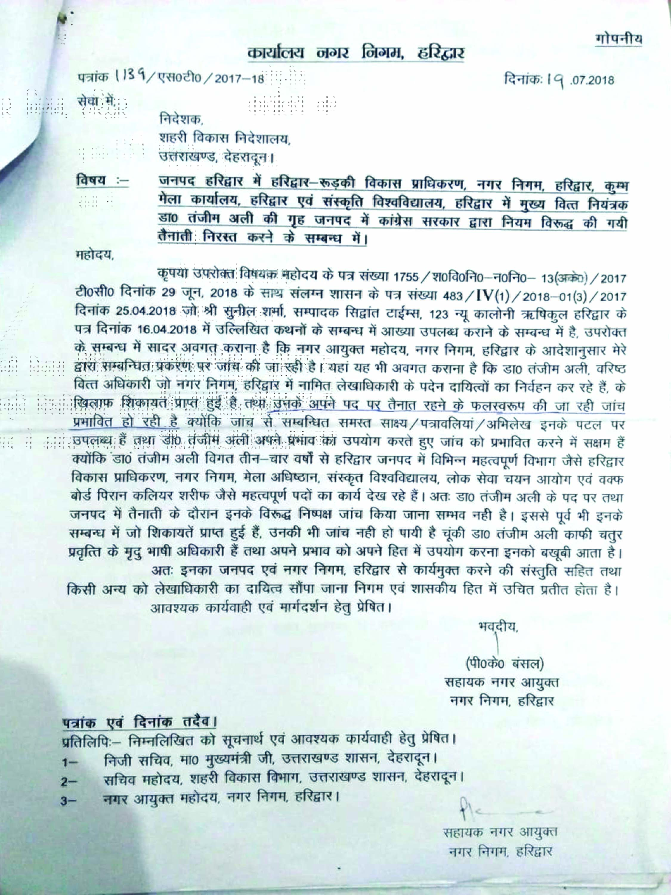 अप्रैल 2018 में मुख्यमंत्री सहित करीब आधा दर्जन विभागों और उच्चाधिकारियों को शिकायत कर सुनील शर्मा ने यह अवगत कराया कि प्रदेश में जब कांग्रेस शासन था तो उस समय मुख्य वित्त नियंत्रक डॉक्टर तंजीम अली ने एक कांग्रेसी विधायक की कøपा से शासनकाल में बड़ी पैठ बना ली थी। जिसके बाद उनके पास एक नहीं, बल्कि आधा दर्जन मलाईदार महकमें आ गए। सबसे बड़ी बात यह है कि वह पिछले 3 वर्षों से अपने गृह जनपद में ही तैनात हैं जबकि नियमानुसार इस स्तर के अधिकारी की तैनाती गृह जनपद में की ही नहीं जा सकती। इनके बैच के अन्य अधिकारियों की तैनाती दुर्गम तथा पहाड़ी इलाकों में की गई है। डॉक्टर तंजीम अली हरिद्वार जनपद के रुड़की के स्थाई निवासी हैं। शिकायती पत्र में सुनील शर्मा ने यह भी आरोप लगाया था कि डॉ अली ने सिंडिकेट बनाकर अपने चहेतों को मोटा कमीशन लेकर अनुचित तरीके से कई बड़े ठेके दिलवाए हैं। इसी तरह उन्होंने मेवाड़ कला निवासी अपने एक नजदीकी ठेकेदार को भी आउट सोर्स का कार्य दिलवाया था जिसके द्वारा एक बडा घोटाला भी किया गया। उन्हांने शासन की अनुमति के बिना ही नियमों के विपरीत कुंभ मेला कार्यालय से अपने चहेतों के कई भुगतान स्वीकøत कराए। यही नहीं डॉक्टर तंजीम अली ने अपनी उंची साख का फायदा उठाकर निजी स्वार्थ के चलते रिटायरमेंट के बाद भी अच्छे पदों पर अपने चहेतों को प्रतिनियुक्ति दी। चर्चाएं हैं कि इस एवज में मोटी रकम भी वसूली गई। कुंभ मेला कार्यालय मदन सिंह तथा नगर निगम में अब्दुल रऊफ की प्रतिनियुक्ति ऐसे ही उदाहरण हैं। 20 जुलाई 2018 को सहायक नगर आयुक्त पीके बंसल ने नोटिस जारी पर तंजीम अली से इस बारे में स्पष्टीकरण भी मांगा था कि जब अवर अभियंता अब्दुल रऊफ का रिटायरमेंट काफी समय पहले हो गया है तो किस आधार पर वे अब भी कार्यालय में कार्यरत हं, पर खुद को पीके बंसल से वरिष्ठ कहने वाले तंजीम अली ने इस संबंध में कोई जवाब नहीं दिया।