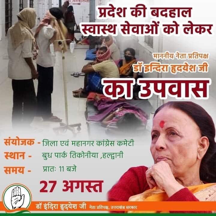 कोरोना काल में राज्य में बिगड़ती स्वास्थ्य व्यवस्था को लेकर नेता प्रतिपक्ष इंदिरा हरदेश ने हल्द्वानी के बुध पार्क में एक दिवसीय उपवास कार्यक्रम रखकर धरना प्रदर्शन किया। राज्य में बदहाल हो रही स्वास्थ्य व्यवस्था को संभालने का जिम्मा स्वयं मुख्यमंत्री के पास है, क्योंकि स्वास्थ्य विभाग मुख्यमंत्री खुद देख रहे हैं। लिहाजा इंदिरा ह्रदयेश ने कहा कि अगर मुख्यमंत्री से स्वास्थ्य महकमा नहीं संभल रहा है तो गद्दी छोड़ कर जाएं, क्योंकि सरकार की नाकामी का खामियाजा आम गरीब लोगों को अपनी जान देकर भुगतना पड़ रहा है। कुमाऊ का सबसे बड़ा सुशीला तिवारी अस्पताल जिसे पूर्व मुख्यमंत्री एनडी तिवारी ने बेहतर स्वास्थ्य के सपने के साथ बनाया था आज उस अस्पताल में जाने से लोग डर रहे हैं। हालात इतने बदले बदतर हैं कि अस्पतालों में सफाई कर्मचारी तक नहीं कोरोना संक्रमण के इस दौर में मरीजों को उचित उपचार तो दूर की बात उचित व्यवहार तक नहीं हो रहा है। इंदिरा हृदयेश ने कहा कि यह राज्य सरकार प्रदेश की जनता को बेहतर स्वास्थ्य देने में पूरी तरह से विफल और नाकाम रही है। लिहाजा आज सांकेतिक रूप से कांग्रेस ने यह प्रदर्शन किया है, आगे और उग्र आंदोलन किए जाएंगे। नेता प्रतिपक्ष ने कहा कि भाजपा को कोरोना महामारी से कोई लेना नहीं है। वह तो नाराज विधायकों को खुश करने में व्यस्त हैं। पाटीॅ में नेताओं की कमी हो रबी है। इसलिए कुंवर प्रणव सिंह चैपिंयन का फूल माला से स्वागत किया गया। भाजपा में दुबारा शामिल होते ही फिर चैम्पियन ने हरिद्वार में अपने क्षेत्र में पहुंच कर हथियारों के साथ प्रदर्शन किया। धरने पर जिला अध्यक्ष सतीश नैनवाल, महानगर अध्यक्ष राहुल छिम्वाल समेत कई पदाधिकारी बैठे।