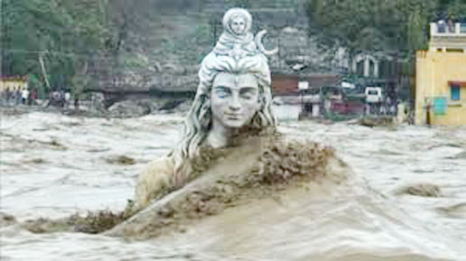 देवताओं की भूमि कहलाए जाने वाले उत्तराखण्ड में भारी बारिश ने तबाही का मंजर पैदा कर दिया है। प्रकृति का सबसे ज्यादा कोप केदारघाटी क्षेत्र में देखने को मिल रहा है। राज्य के रूद्रप्रयाग जनपद में केदारनाथ से निकलने वाली मंदाकिनी नदी और बद्रीनाथ से आने वाली अलकनंदा नदी में लगातार हो रही बारिश के चलते जलस्तर इतना बढ़ चुका है कि इनके संगम स्थल रुद्रप्रयाग में शिव की प्रतिमा लगभग डूब चुकी है। 20 फीट ऊंची इस प्रतिमा में पानी शिव की गरदन तक आने के साथ ही नदी के चारों तरफ बने धार भी पूरी तरह जलमग्न हो चुके हैं। राज्य के सभी पहाड़ी जिलों में भारी वर्षां के चलते जगह-जगह बादल फटने की घटनाएं हो रही हैं। भारतीय मौसम विभाग पहले ही उत्तराखण्ड में भारी बारिश का रेड अलर्ट जारी कर चुका है।