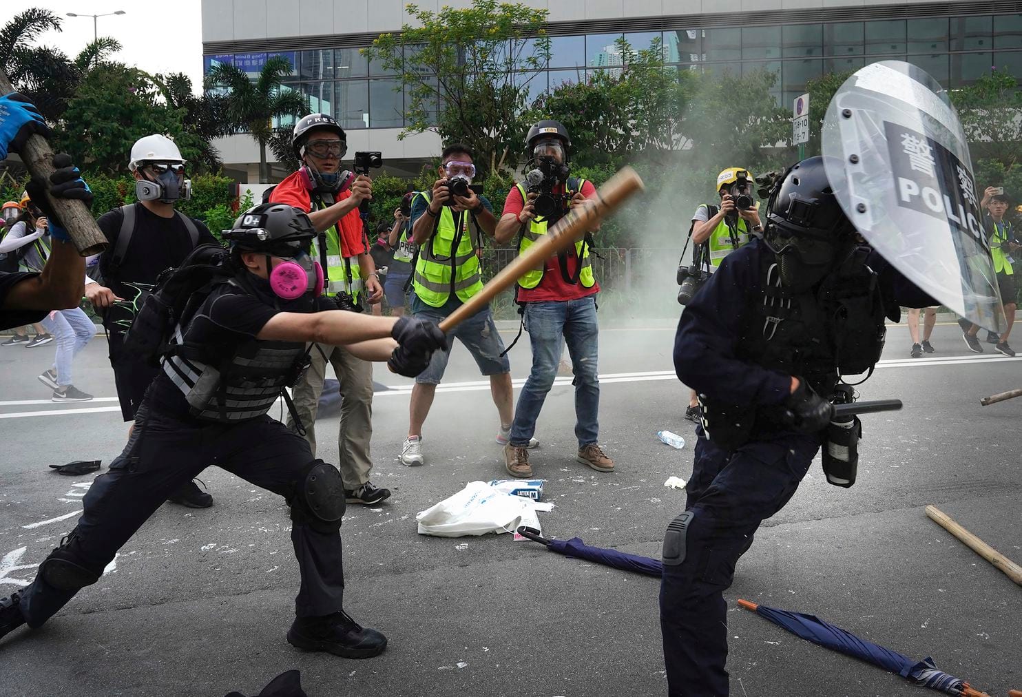 काले कपड़ों में प्रदर्शन कर रहे सैकड़ों प्रदर्शनकारियों के हाथ में बांस की लाठियां और बेसबॉल के बल्ले थे जिनके जरिए उन्होंने मुख्य मार्ग पर लाठीचार्च कर रहे पुलिस अधिकारियों के साथ झगड़ा किया।