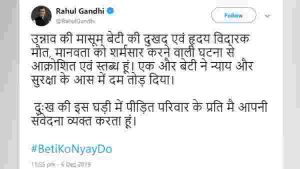 इससे पहले कांग्रेस नेता द्वारा उन्नाव रेप पीड़िता की मौत पर दुःख जताया गया। उन्होंने ट्वीट किया ‘ उन्नाव की मासूम बेटी की दुखद एवं हृदय विदारक मौत, मानवता को शर्मसार करने वाली घटना से आक्रोशित एवं स्तब्ध हूं। एक और बेटी ने न्याय और सुरक्षा के आस में दम तोड़ दिया। दुःख की इस घड़ी में पीड़ित परिवार के प्रति मै आपनी संवेदना व्यक्त करता हूं।’