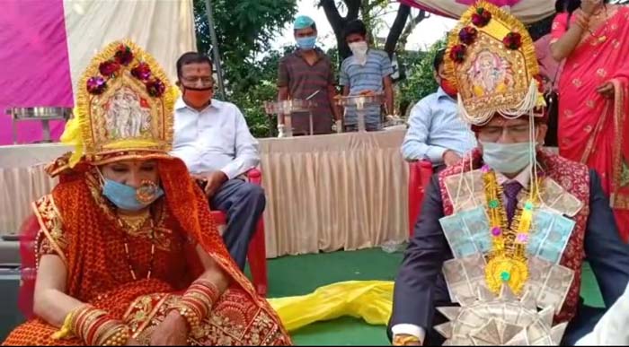 आज से नैनीताल जिला रेड जोन के अंतर्गत आ चुका है लिहाजा पुराने नियम कानूनों में तब्दीली भी हो गई है लिहाजा इसी तब्दीली के हिसाब से रेड जोन में आज पहली बारात पहुंची जहां सोशल डिस्टेंसिंग का ध्यान रखते हुए कुमाऊनी रीति रिवाज के साथ शादी का आयोजन हुआ। दूल्हा हरीश और दुल्हन अंजू सात फेरे लेकर एक दूजे के सात जन्मों के बंधन में बंधे। रेड जोन घोषित होने के बाद आई पहली बारात में दूल्हा-दुल्हन और वर-वधू पक्ष भी मास्क में नजर आए।