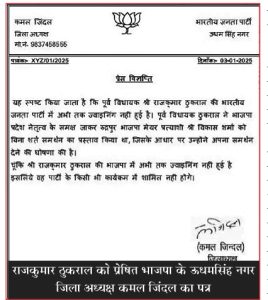 ऊधमसिंह नगर से भाजपा के जिला अध्यक्ष कमल जिंदल ने इस बाबत एक पत्र जारी किया है। जिसके बाद ठुकराल की पार्टी वापसी को लेकर सस्पेंस खड़ा हो गया है। भाजपा जिलाध्यक्ष कमल जिंदल ने जो लेटर जारी किया, उसमें स्पष्ट है कि पूर्व विधायक राजकुमार ठुकराल की अभी तक भाजपा में ज्वाइनिंग नहीं हुई है। ऐसे में कहा जा रहा है कि राजकुमार ठुकराल न घर के रहे न घाट के।