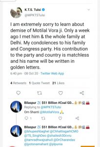 आज देर शाम राज्यसभा सांसद केटीएस तुलसी के एक भ्रामक ट्वीट के चलते कांग्रेस के वरिष्ठ नेता मोतीलाल वोरा के निधन की अफवाहें फैल गई । पूरे देश में यह खबर आग की तरह फैली । हालाकि कुछ देर बाद ही केटीएस तुलसी ने अपने ट्वीट को हटा दिया। राज्यसभा सांसद और पूर्व राज्यपाल रहे मोतीलाल वोरा के पुत्र अरुण वोरा ने इस मामले में खुद आगे आकर स्पष्टीकरण देते हुए कहा है कि उनके पिताजी बिल्कुल स्वस्थ है और एम्स में इलाज करा रहे हैं।