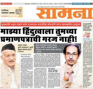 शिवसेना ने सामना में कहा कि मुख्यमंत्री ने विशेष ठाकरी शैली में राज्यपाल को कड़ा उत्तर दिया है, यह सच है। सामना में लिखा, ‘ठाकरे ने कड़े शब्दों में कहा, ‘राज्यपाल महोदय, संविधान के अनुसार आपने राज्यपाल पद की शपथ ली है। आपको देश का संविधान व धर्मनिरपेक्षता स्वीकार नहीं है क्या? और आपको हमारे हिंदुत्व पर कुछ बोलने की आवश्यकता नहीं है। मेरे हिंदुत्ववाद को आपके प्रमाण पत्र की आवश्यकता नहीं है।’ इस प्रकार से मुख्यमंत्री ठाकरे ने एक लोहार की देते हुए ये दिखा दिया कि महाराष्ट्र का स्वाभिमान, अभिमान और तेवर क्या होता है? इस मामले में राज्यपाल ने आ बैल मुझे मार जैसा बर्ताव किया। लेकिन यहां बैल नहीं, बल्कि ‘शेर’ है, इस बात को वे कैसे भूल गए?’