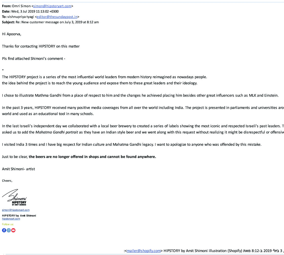 आम आदमी पार्टी के राज्यसभा सांसद संजय सिंह ने 3 जुलाई को राज्यसभा में राष्ट्रपिता महात्मा गांधी का इजराइल की एक कंपनी द्वारा अपमान किए जाने का मुद्दा उठाया था। बकौल संजय सिंह इजराइल की एक शराब कंपनी और अमित शिमोनी नाम के एक आटिस्ट की कंपनीwww. hipstoryart.com संग मिलकर महात्मा गांधी के चित्रों को बीयर की बोतल में लगाकर उन्हें बेचने का काम कर रही है। संजय सिंह ने राज्यसभा के उपसभापति वेंकैया नायडू से इस बाबत आग्रह किया कि वे सरकार को निर्देश दें जिससे राष्ट्रपिता के इस अपमान को रोका जा सके। प्रतिपक्ष के नेता गुलाम नबी आजाद ने भी इस पर अपनी कड़ा प्रतिरोध राज्यसभा में किया। उपसभापति ने भी इसे गंभीर मुद्दा मानते हुए विदेश मंत्री को कार्यवाही करने की बात कही थी। ‘दि संडे पोस्ट’ ने इस मामले को गंभीरता से लेते हुए अमित शिमोनी से ईमेल पर संपर्क साधा। शिमोनी ने ‘दि संडे पोस्ट’ के प्रश्नों का उत्तर देते हुए कहा है ‘मैं हर उस शख्स से माफी मांगता हूं जिसे महात्मा गांधी की तस्वीर बीयर की बोतल में देखकर कष्ट हुआ है। मैं भी तीन बार भारत आ चुका हूं और मेरी भारत की संस्कृति और महात्मा गांधी के प्रति बहुत श्रद्धा है। मैं बताना चाहता हूं कि ऐसी सभी बीयर बोतलों को तत्काल बीयर निर्माता ने मार्केट से हटा लिया है।’