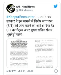 उत्तर प्रदेश सरकार ने कानपुर कांड की जांच के आदेश दे दिए हैं। 3 जुलाई को मारे गए आठ पुलिसकर्मियों के साथ ही गैंगस्टर विकास दुबे का इनकाउंटर और उसके साथ किन-किन लोगों के संबंध थे और उन संबंधों के बल पर कहां कहां कितने अवैध कब्जे किए गए। इसकी भी जांच की जाएगी। साथ ही जांच का विषय यह भी होगा कि गैंगस्टर विकास दुबे का पुलिस से कितना संपर्क था और वह किस-किस के संपर्क में रहा।