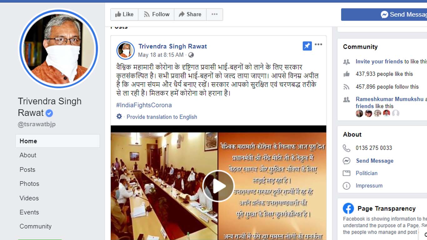 हाल ही में मुख्यमंत्री कार्यालय द्वारा अधिकृत फेसबुक अकाउंट पर जारी की गई पोस्ट को देखें तो इससे साफ हो गया है कि मुख्यमंत्री के सोशल मीडिया को चलाने वाली टीम नैसिखियों की तरह काम कर रही है। प्रवासी उत्तराखण्डियों को प्रदेश में सुरक्षित वापस के लिए स्वयं मुख्यमंत्री के सोशल मीडिया एकाउंट से त्रिवेंद्र रावत को धन्यवाद दिया गया है। मुख्यमंत्री को अपने ही राज्यवासियों को वापस लाने के लिए स्वयं को अनेक धन्यवाद प्रेषित किया गया है।