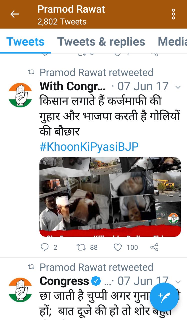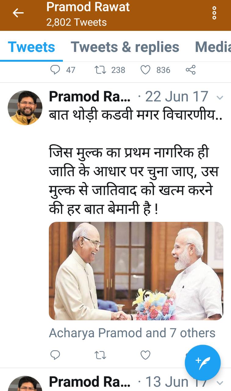 प्रमोद ने पूर्व में ट्वीटर पर जमकर केंद्र और प्रदेश सरकार के खिलाफ पोस्ट की हैं और कई पोस्टों को साझा भी किया गया। यही नहीं प्रधानमंत्री के खिलाफ कई अपमानजनक पोस्टों को रिट्वीट किया है। यहां तक कि राष्ट्रपति श्री रामनाथ कोविंद के राष्ट्रपति बनने पर भी गंभीर आरोप लगाए गए हैं। अपनी पोस्ट में प्रमोद रावत ने लिखा है कि जिस मुल्क का प्रथम नागरिक ही जाति के आधार पर चुना जाए उस मुल्क से जातिवाद को खत्म करने की ही बात बेमानी है। प्रदेश सरकार औेर मुख्यमंत्री त्रिवेंद्र रावत के खिलाफ भी सोशल मीडिया में जमकर भड़ास निकाली है। पोस्ट में मुख्यमंत्री के लिए लिखा है कि त्रिवेंद्र से मोहभंग।