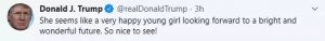 इस पर अमेरिकी राष्ट्रपति ने अपने”ट्वीट के जरिए तंज कसा कि वह हैप्पी गर्ल अपने उज्ज्वल व अदभुद भविष्य की ओर देख रही है। उसे देखना काफी सुखद है।”जिसका अब पूरी दुनिया राष्ट्रपति ट्रंप के इस विवादित ट्वीट पर निराशा ब्यक्त कर रही है। दरअसल राष्ट्रपति ट्रंप इस जलवायु सम्मेलन में हिस्सा लेने देर में आए। उन्होंने जलवायु सम्मेलन में हिस्सा लेने के बजाए एक धार्मिक कार्यक्रम में हिस्सा लेने को प्राथमिकता दी। अमेरिकन एंवायरंमेंट फॉर चेंजिग ग्लोबल ने कहा ग्रेटा कहीं से भी हैप्पी यंग गर्ल नजर नहीं आती।