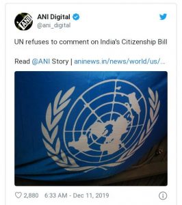 संयुक्त राष्ट्र द्वारा भारत के नागरिकता संशोधन विधेयक पर कोई भी टिप्पणी देने से साफ़ इंकार कर दिया गया है। भारत के निचले सदन में यह बिल पास हो चुका है। संयुक्त राष्ट्र के महासचिव एंटोनियो गुटेरेस के उप प्रवक्ता फरहान हक से जब विधेयक के पारित होने के बारे में संयुक्त राष्ट्र की प्रतिक्रिया के बारे में पूछा गया तो उन्होंने कहा ,’जहां तक मुझे जानकारी है, यह कानून एक विधायी प्रक्रिया से गुजर रहा है। जब तक यह विधेयक विधायी प्रक्रिया से गुजर रहा है ,तब तक हम इसपर कोई टिप्पणी नहीं करेंगे।’