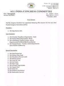 कांग्रेस ने आज उत्तर प्रदेश कांग्रेस कमेटी की आधिकारिक घोषणा कर दी है । तमकुहीराज से दो बार के विधायक अजय कुमार लल्लू उत्तर प्रदेश कांग्रेस कमेटी के अध्यक्ष होंगे। हर पदाधिकारियों की जिम्मेदारी और जबाबदेही तय की गई है। नई कमेटी पिछली कमेटी की अपेक्षा दस गुना छोटी है । पिछली कांग्रेस कमेटी लगभग 500 लोगों की थी, लेकिन नई कमेटी लगभग 40-45 लोगों की है। नई कमेटी के हर पदाधिकारी की खास जिम्मेदारी और जबाबदेही पहले से तय है।