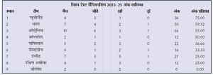 दक्षिण अफ्रीका के खिलाफ दूसरे टेस्ट में जीत के बाद 75 अंकों के साथ न्यूजीलैंड की टीम अंक तालिका में शीर्ष पर पहुंच गई है। न्यूजीलैंड ने वर्ल्ड टेस्ट चैंपियनशिप 2023-25 के तहत अभी तक चार टेस्ट खेले हैं और तीन में उसे जीत मिली है। एक में टीम को हार मिली है, वहीं ऑस्ट्रेलिया ने 2023-25 सत्र में 10 टेस्ट खेले हैं और छह में जीत हासिल की है। तीन में कंगारुओं को हार का सामना करना पड़ा है। एक मैच ड्रॉ रहा है। भारत ने सात टेस्ट खेले हैं और चार जीते हैं। टीम इंडिया को दो मुकाबलों में हार मिली है। एक टेस्ट ड्रॉ रहा है।